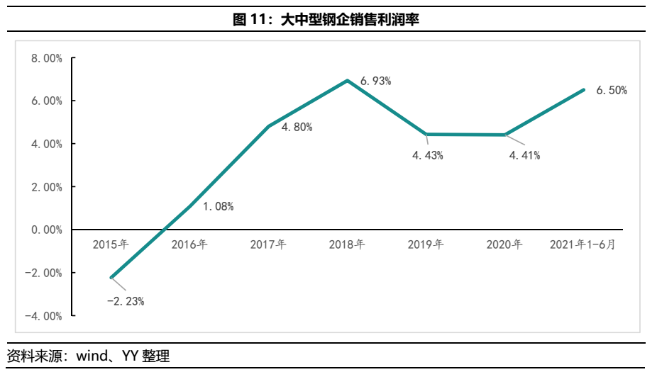 鋼材價(jià)格也紛紛漲至高點(diǎn),五一后熱軋卷板現(xiàn)貨成交價(jià)突破6000元/噸,近期有一定回落。高礦價(jià)、高鋼價(jià)下,鋼廠利潤(rùn)大幅改善,2021年上半年大中型鋼企銷售利潤(rùn)率重新回到6.5%的水平。