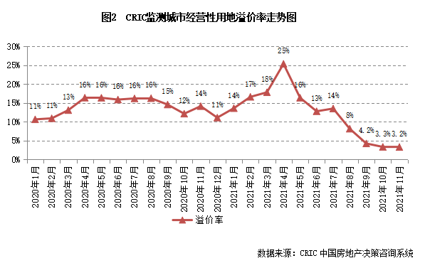 整體來看,11月的土地市場延續了低溫態勢,深圳、南京、蘇州和無錫等城市第三輪土拍熱度均不敵二輪,22城之外的集中供地城市新一輪集中土拍熱度也持續下滑,導致本月溢價率再度走低,僅為3.2%。
