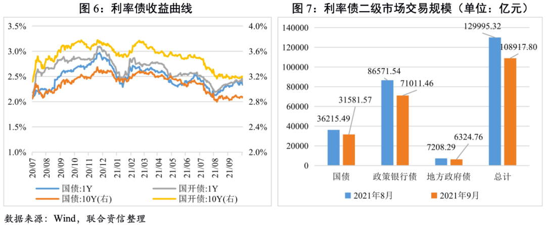 9月利率債收益率先升后降,收益率曲線繼續走平。9月上半月市場流動性趨緊,利率債收益率上行;月中隨著央行加大公開市場操作力度,市場流動性逐步轉松,利率債收益率小幅下行。但近期我國經濟復蘇持續放緩,受此影響,總體上看9月短端收益率上行幅度大于長端收益率上行幅度,收益率曲線進一步趨于平緩。從交易規模看,9月國債、地方政府債和政策銀行債交易規模相較8月均出現不同程度回落。