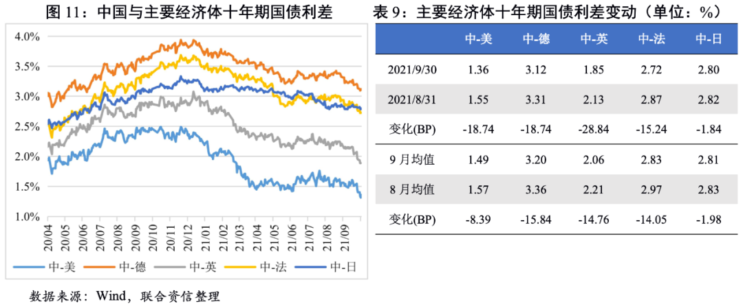 ?國別利差:9月美國、德國、英國、法國、日本十年期國債收益率均值全面上行,我國與上述經濟體十年期國債利差均值普遍收窄。