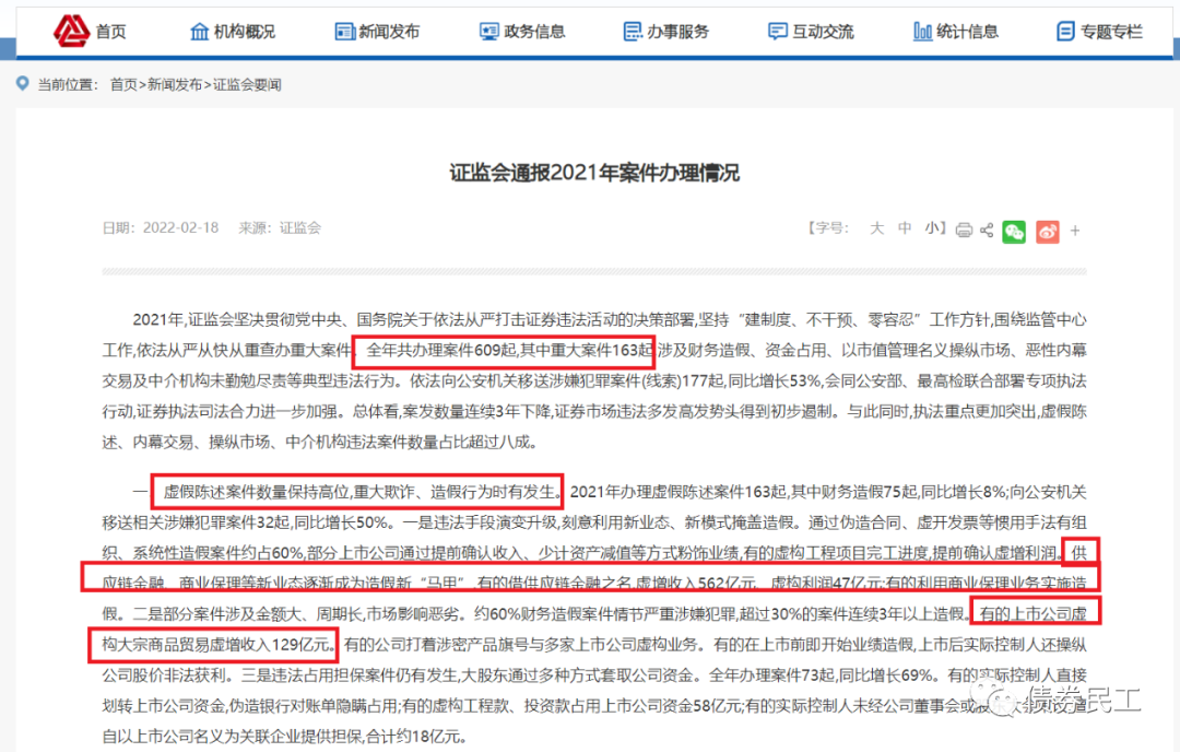根據中國證監會2022年2月18日發布的《證監會通報2021年案件辦理情況》,虛假陳述案件中,供應鏈金融、商業保理、大宗商品貿易等成為了造假的高發領域,某案件借供應鏈融資之名虛增收入竟高達562億元?。。?/p>