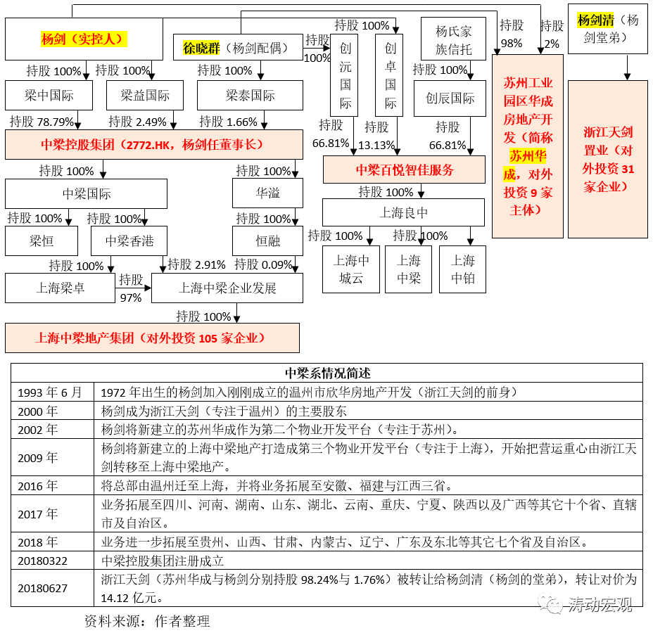 2、中梁系有五家運作主體,具體包括中梁控股集團(港股上市)、中梁百悅智佳服務(物業公司)、上海中梁地產集團(中梁的國內運作主體)以及蘇州華成和浙江天劍(2018年6月以14.12億元的對價轉讓給楊劍清)。