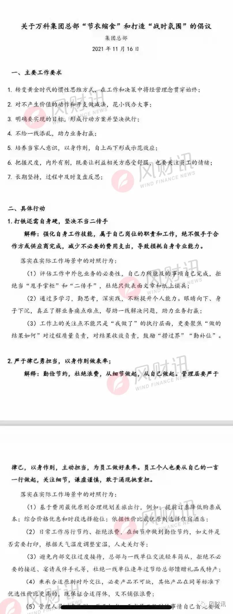 2021年11月16日,萬(wàn)科集團(tuán)總部下發(fā)了一份《關(guān)于萬(wàn)科集團(tuán)總部“節(jié)衣縮食”和打造“戰(zhàn)時(shí)氛圍”的倡議》。
