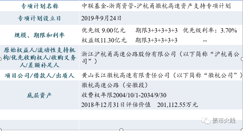 這個交易結構是非常典型的類reits項目交易結構。項目公司徽杭公司由原始權益人滬杭甬公司100%控股,滬杭甬公司擁有AAA的強主體評級。項目公司在2019年6月4日減少注冊資本以前,注冊資本為19.50億元。截至2019年3月末,項目公司總資產18.91億元,總負債0.37億元,可以說基本就是股東注資=高速公路及附屬設施建設形成資產的財務結構。