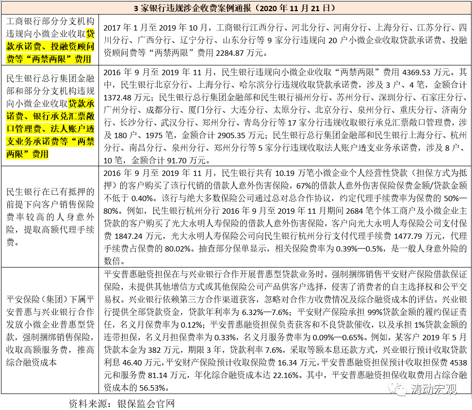 2020年11月21日,國務(wù)院辦公廳督查室、銀保監(jiān)會辦公廳聯(lián)合發(fā)布《關(guān)于部分銀行保險機構(gòu)助貸機構(gòu)違規(guī)抬升小微企業(yè)綜合融資成本典型問題的通報》,指出工行部分分支機構(gòu)、民生銀行、平安保險(集團)下屬平安普惠等機構(gòu)在貸款中違規(guī)收取應(yīng)減免費用,強制捆綁銷售,收取高額服務(wù)費和代理手續(xù)費。