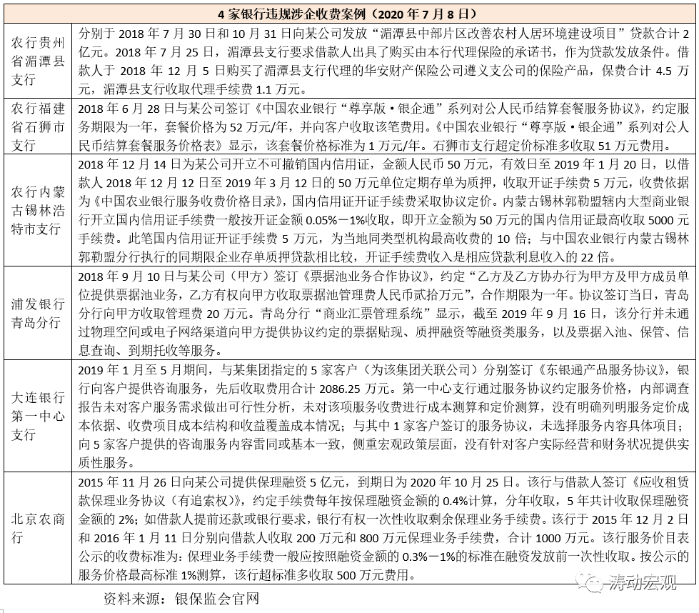2020年7月8日,銀保監(jiān)會消費者權(quán)益保護發(fā)布《關(guān)于銀行違規(guī)涉企收費案例的通報》,通報了6個違規(guī)涉企收費案例,具體涉及農(nóng)行(3個案例)、浦發(fā)銀行、大連銀行以及北京農(nóng)商行等4家銀行。