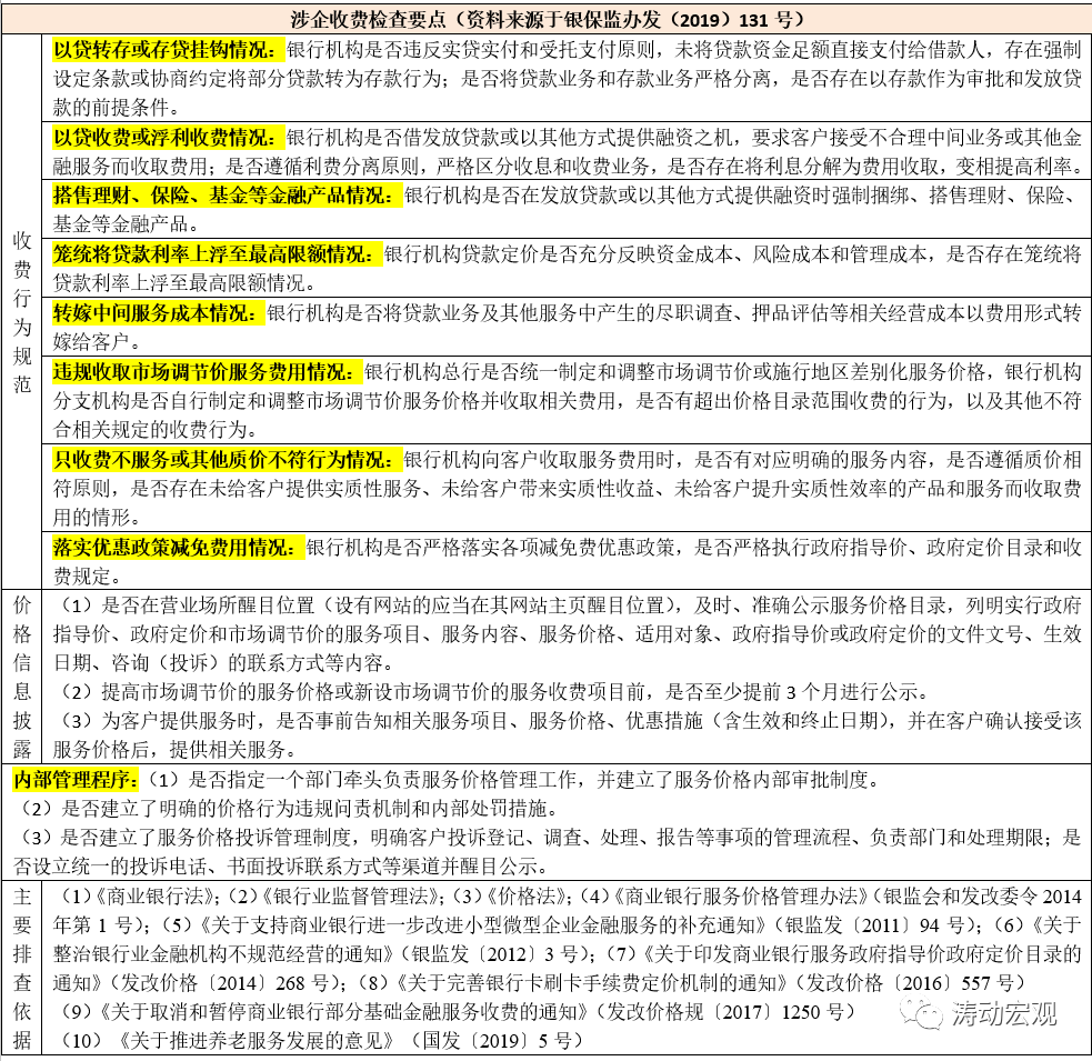 2019年5月27日,銀監(jiān)會發(fā)布《關(guān)于開展銀行違規(guī)涉企服務(wù)收費專項治理工作的通知》(銀保監(jiān)辦發(fā)(2019)131號),明確提出相關(guān)檢查要求與制度依據(jù),具體可見下表,這里不再贅述。