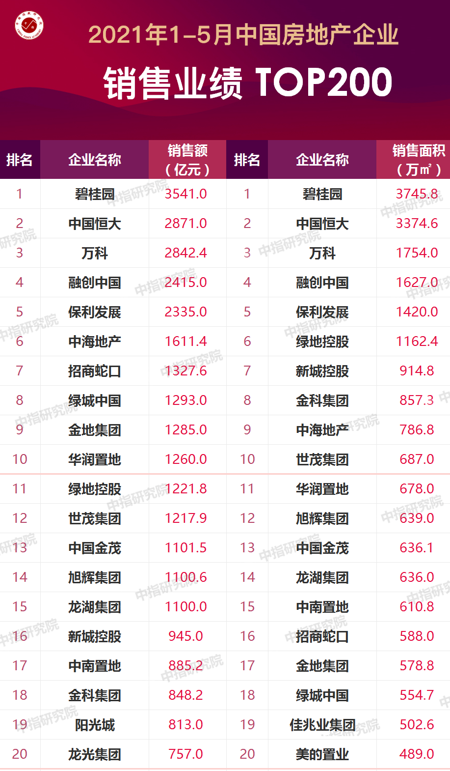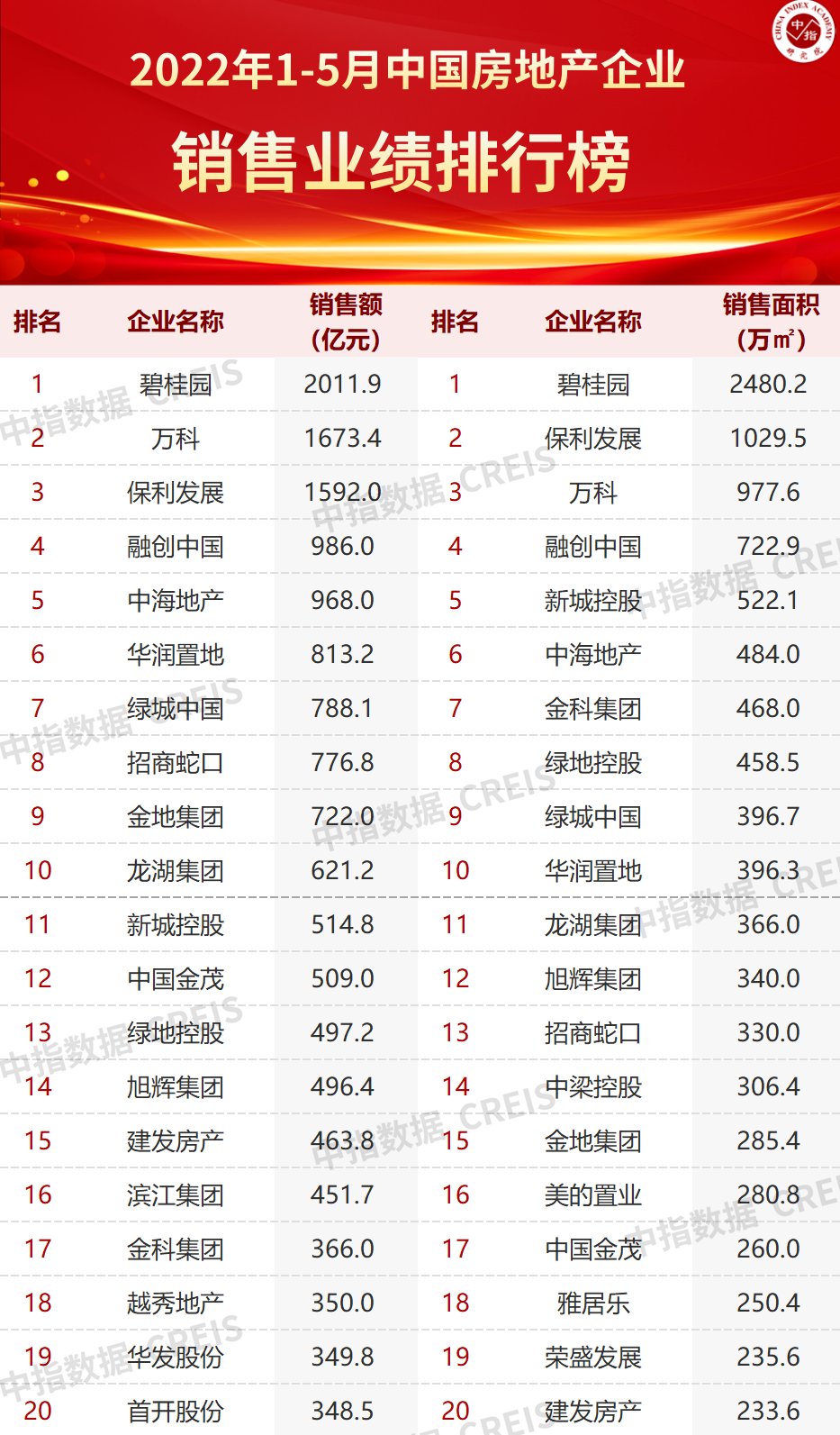 2022年5月31日傍晚,中指研究院發布了“2022年1-5月中國房地產企業銷售排行榜”。