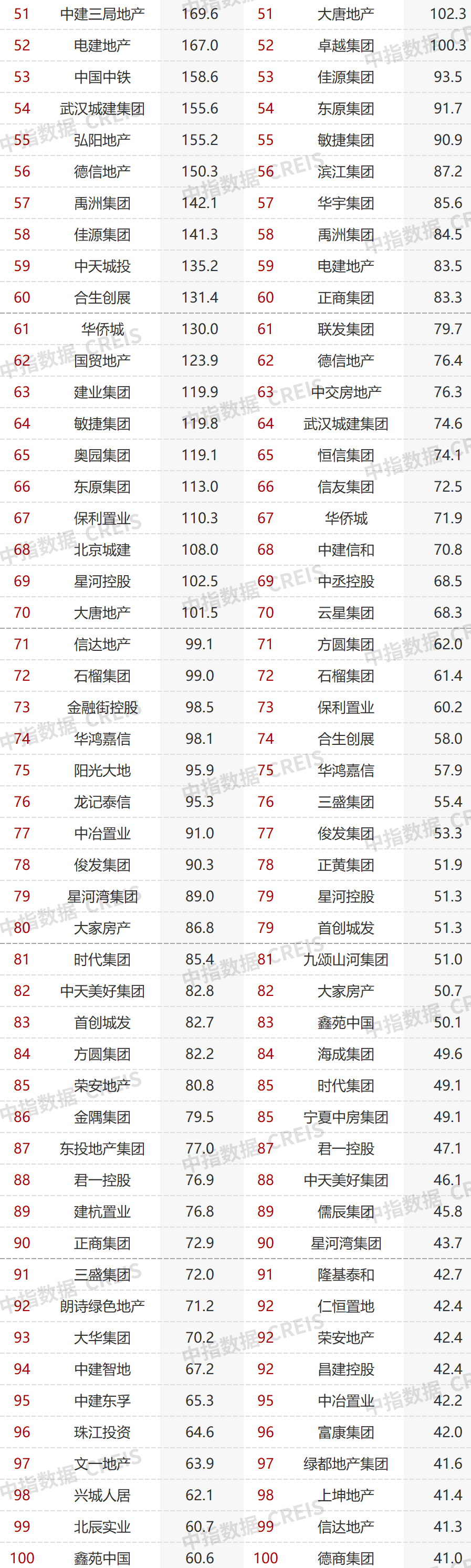 3)51-100位,俊發集團、華鴻嘉信、三盛集團、大華集團、大發地產、正商集團等降幅有點大,花樣年、當代置業好像有點放飛自我。仁恒置地略有提升,位次從2021年前5月的53位,殺入前50,剛好50名。聯發集團也殺入前50,49。中建三局地產也從95提升到51,差點就殺入50。