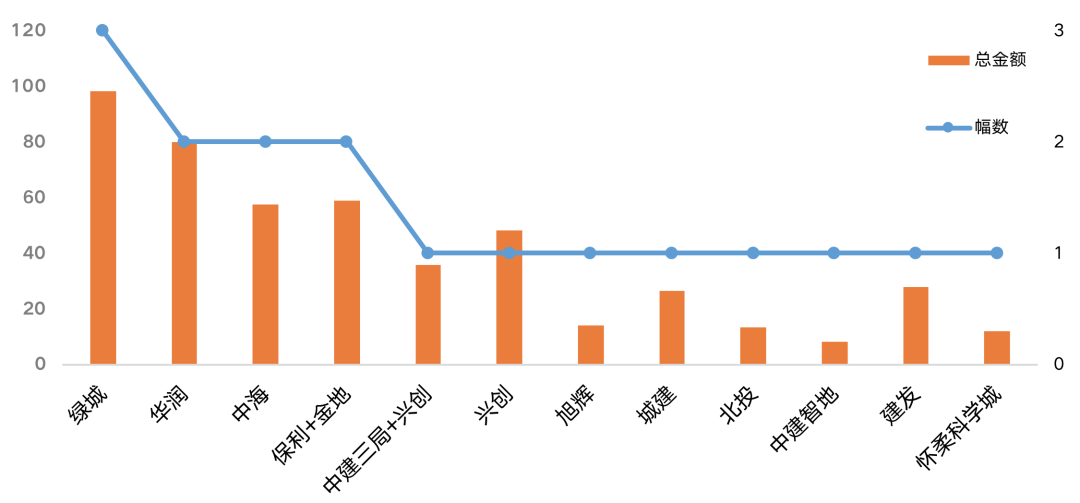 此外,規(guī)模房企旭輝、建發(fā)也有所斬獲,北京本土平臺(tái)公司(興創(chuàng)、北京城建、北投、懷柔科學(xué)城)拿地占比約為三成左右(按幅數(shù)計(jì)算)。