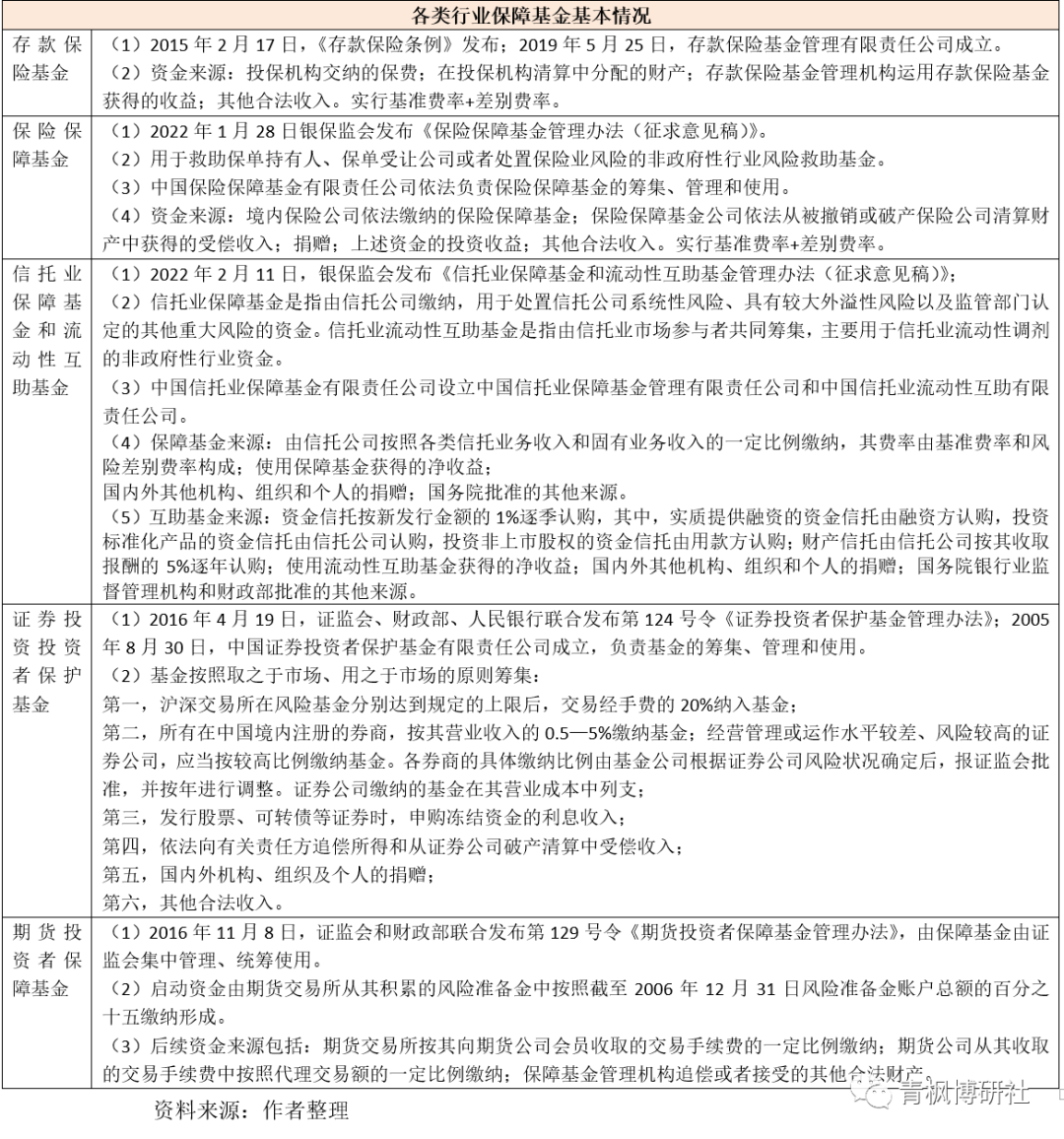 1、目前國內已有存款保險基金、保險保障基金、證券投資者保護基金、信托業保障基金、流動性互助基金、期貨投資者保障基金等諸多行業性保障基金,在各細分金融行業救助方面起到了重要作用。以上行業保障基金的共性如下: