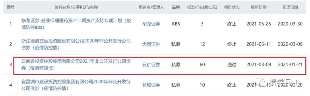 不只是在債券一級發(fā)行方面,在債券申報方面,疫情防控債也失去了吸引力。2021年至今,上交所審核通過的疫情防控債只有云南省投資控股集團有限公司2021年非公開發(fā)行公司債券(疫情防控債)一只債券,擬發(fā)行金額為60億元,其余三只債券產品和ABS產品均終止。但是上述債券批文在2021年暫未發(fā)行。