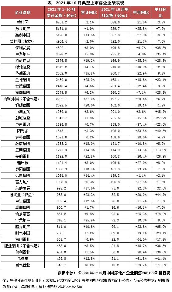 2021年10月,TOP100房企實現銷售操盤金額7761.4億元,單月業績規模較9月環比回升1.4%。自7月以來市場降溫明顯,10月單月業績較去年同期呈下跌趨勢,但降幅略有收窄至32.2%。從今年以來的累計業績來看,1-10月百強房企實現銷售操盤金額93347.2億元,同比增長6.7%,較2019年同期也增長18.5%,累計業績增速放緩。