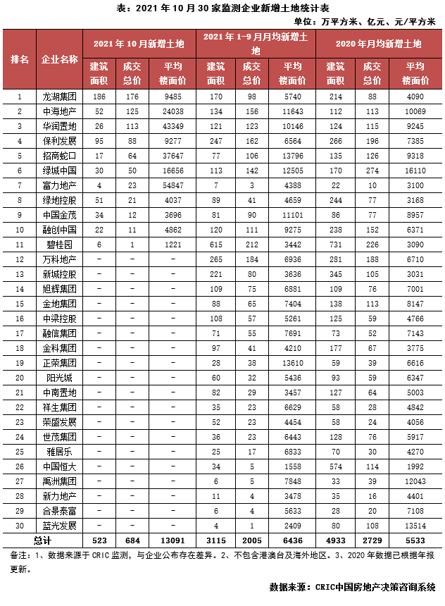 受10月假期及土拍規模等結構性影響,30家重點房企投資力度回落,投資規模為全年最低。本月30家典型房企新增土儲總建面為523萬平方米,環比下降58%;新增土地成交價格684億元,環比下降40%,已經降至全年最低。平均樓板價13091元/平方米,與上月相比上升44%。均價上升主要由于北京、上海和杭州等城市第二輪集中土拍帶動,拉高平均樓板價。