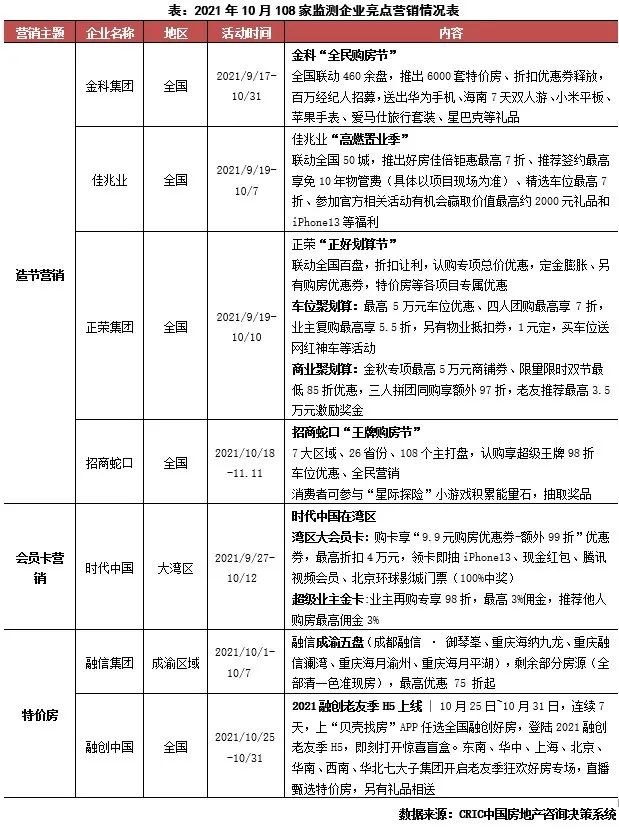 10月仍以造節為主,折扣力度平穩,部分特價房優惠較大,時代、招商采取會員制、游戲活動營銷以擴大用戶基數,增強用戶粘性。從營銷方式來看,本月房企營銷仍然以造節營銷為主,活動形式大同小異,優惠讓利也比較平穩,少數地區特價房力度較大,像融信成渝地區準現房最高折扣可達75折。另外需要關注的是,本月時代中國推出了灣區大會員卡、超級業主金卡等活動,9.9元享折扣,可抽取iphone13等獎品,而招商蛇口“王牌購房節”則需要客戶完成任務,參與小游戲來賺取能量石,才能參與抽獎,獲得折扣,兩種活動雖然形式不同,但是基于客戶運營思維,擴大客戶基數,增強用戶粘性。