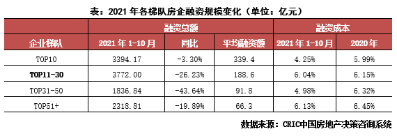 企業表現:本月融資總量最高的企業為招商蛇口,融資總量約87.5億元,主要是向境外銀行申請了20億港元的貸款和為多家子公司進行了擔保。從企業梯隊來看,2021年1-10月平均額最大為TOP10房企,平均融資額339.4億元,融資總額微降3.3%;TOP31-50梯隊融資總額同比降幅最大,降幅達到43.64%。成本來看,4個梯隊均較2020年全年下降,其中TOP10梯隊的融資成本最低,為4.25%,下降幅度為1.74pct,降幅最大。