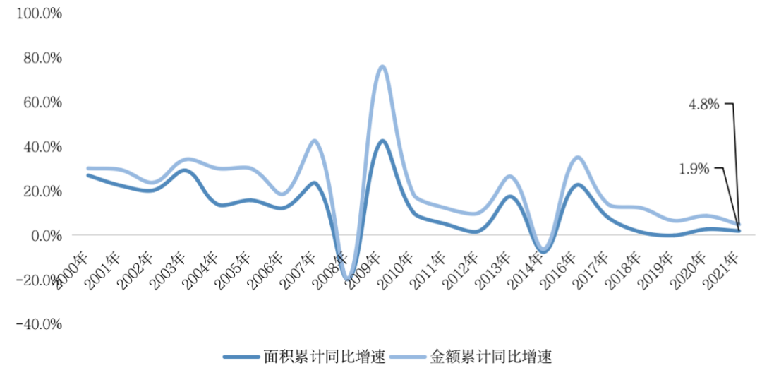 2021年,商品房銷售面積17.9億平方米,比上年增長1.9%;商品房銷售額18.2萬億元,增長4.8%。上半年市場表現是全年創新高的主要支撐,2021年上半年和下半年商品房銷售面積分別同比增28%和降15%。