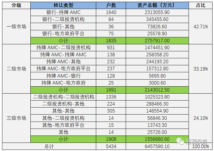 一般的,我們將銀行端出包為一級市場,持牌AMC出包為二級市場,除此為三級市場。