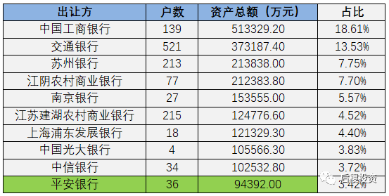 經整理,發(fā)現共有32家銀行的交易記錄,其中出讓金額最大的是工商銀行,達到51.33億元;出讓戶數最多的是交通銀行,共有521戶。上表所示前十大銀行全年共出讓資產金額為201.49億元,占比超過七成。所以,雖然市場供應方增加但出讓資產仍比較集中。