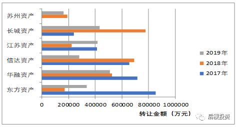 從上圖所知,華融資產、長城資產、江蘇資產位列前三甲,且出讓金額均超過40億元;相比2018年,信達資產和東方資產情況截然相反,分別減幅和增幅近半。成立于2016年5月底的蘇州資產,17年沒有出讓記錄,這兩年出讓金額穩(wěn)定在20億左右。