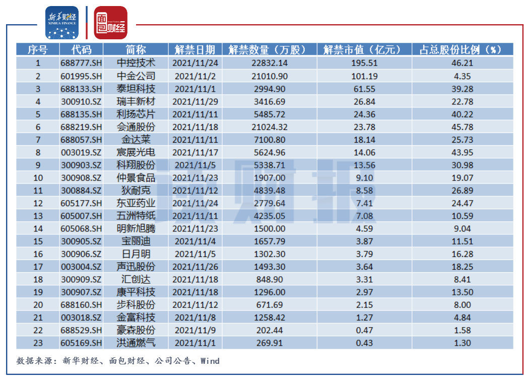 此外,共有23家公司、37億限售股將于11月迎上市周年解禁,解禁市值逾500億元,包括中控科技、中金公司等企業。