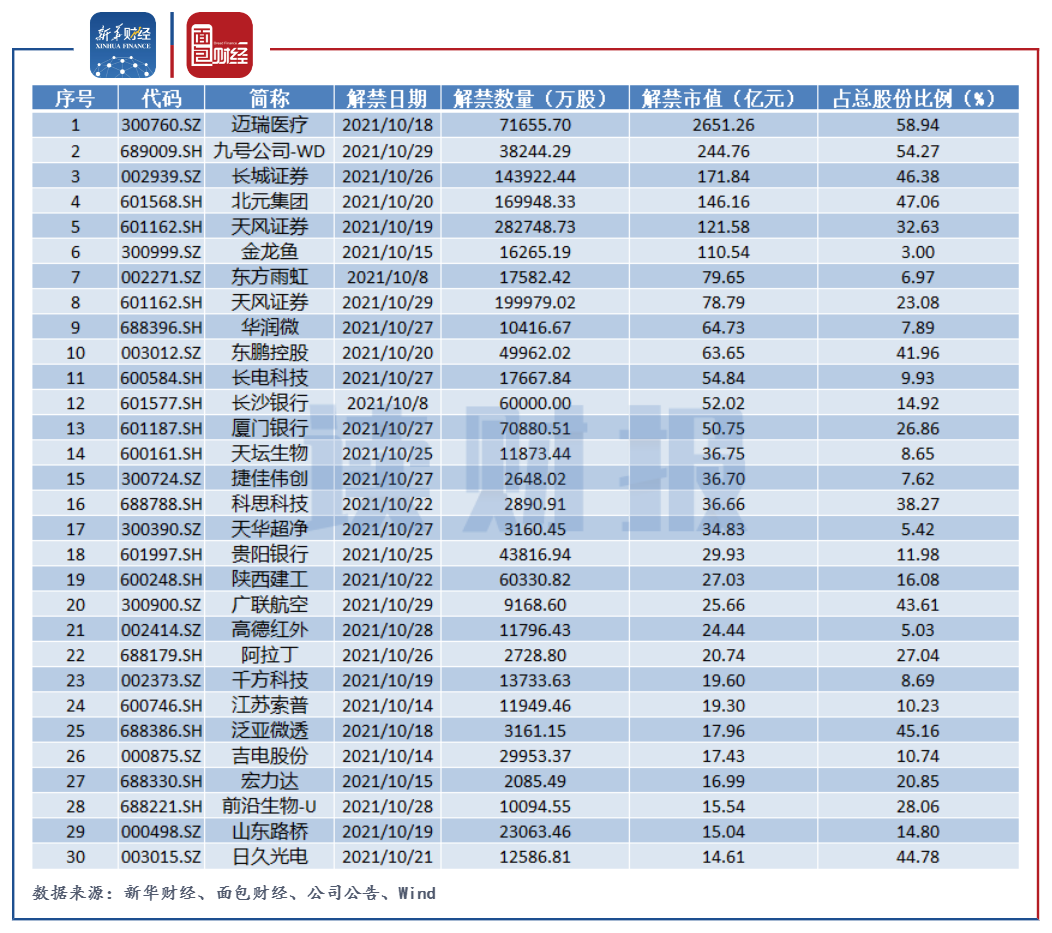 數據顯示,剔除上市新股,10月滬深兩市共計137家限售股解禁。以10月29日收盤價計算,邁瑞醫療解禁規模居首。