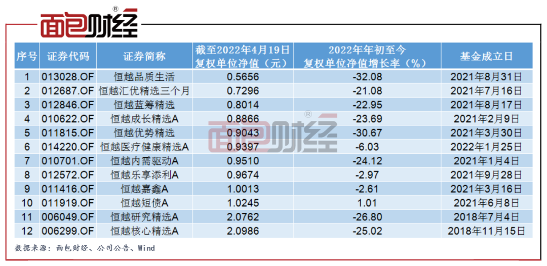 雖然恒越基金的管理規(guī)模大幅擴張,但基金產品的業(yè)績表現(xiàn)卻并不理想。2022年年初至今(截至2022年4月19日,下同),恒越基金在管的12只基金產品中,有8只產品復權單位凈值跌幅在20%以上,其中2只產品復權單位凈值跌幅超過30%。