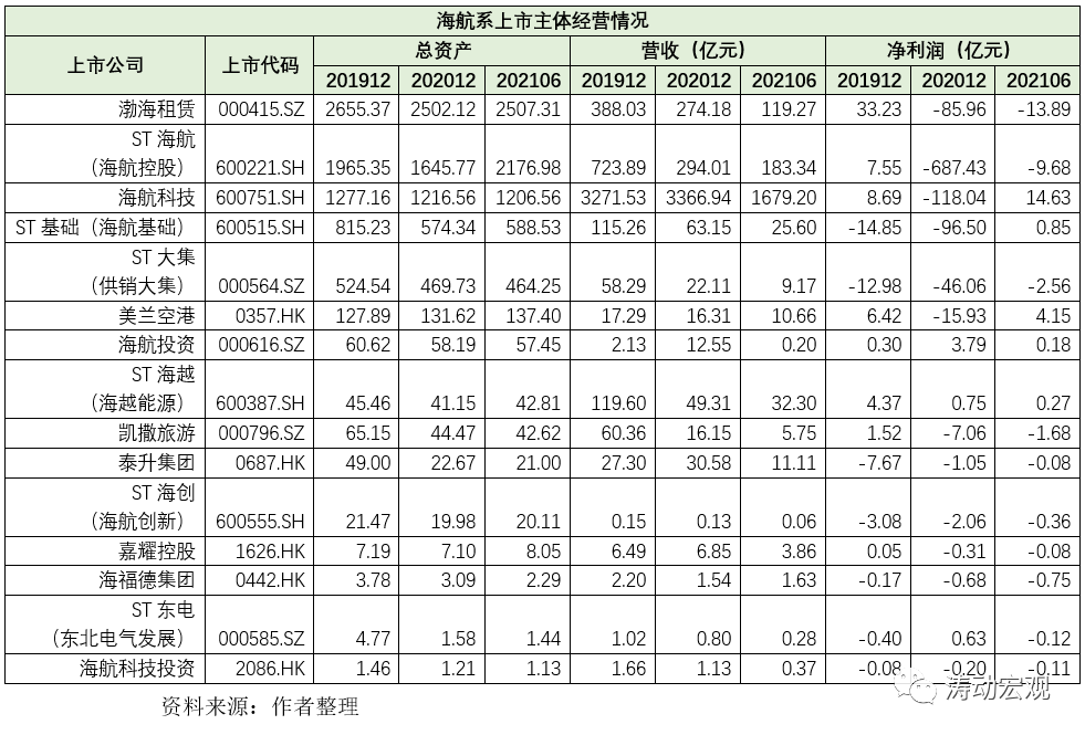 根據(jù)我們的統(tǒng)計(jì),除以上主體外,海航系還擁有至少15家上市主體,具體包括10家A股上市公司以及5家港股上市公司。這10家A股上市公司分別為海航控股、海航基礎(chǔ)、海航科技、供銷(xiāo)大集、海航投資、海越能源、海航創(chuàng)新、東北電氣發(fā)展以及渤海租賃等,5家港股上市公司分別為美蘭空港、泰升集團(tuán)、嘉耀控股、海福德集團(tuán)以及海航科技投資等。