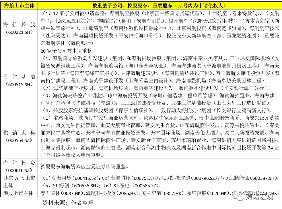 根據(jù)公告信息顯示,向法院申請(qǐng)債務(wù)重整的金融機(jī)構(gòu)類(lèi)債權(quán)人主要包括海南銀行、長(zhǎng)安銀行(曾經(jīng)被海航系參股)、平安銀行、金元證券、玉龍租賃、中國(guó)華融。此次重整還涉及60家左右的子公司,具體看海航控股涉及12家子公司、海航基礎(chǔ)涉及20家子公司、供銷(xiāo)大集涉及24家子公司。