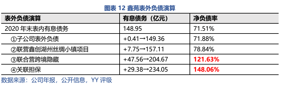 表內有息債務總體收縮,但非標規模高居不下,嚴重拖累融資成本,若繼續惡化則極可能面臨資金鏈危機。此外,表外負債藏匿規模較大,債務明顯出表,調整后觸及兩條紅線,負債情況堪憂。