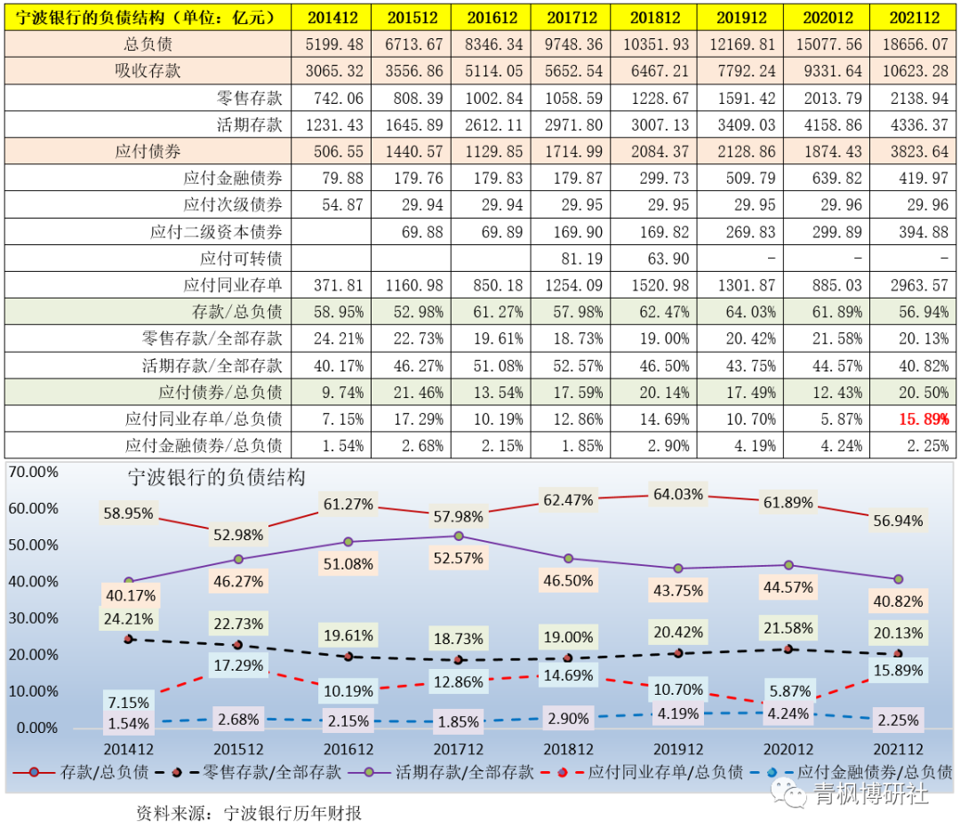 和其它銀行不同的是,寧波銀行的應(yīng)付債券規(guī)模較高,2021年底占其總負(fù)債的比例達(dá)到20.50%,較2020年底大幅上升8.07個(gè)百分點(diǎn)。進(jìn)一步看,應(yīng)付債券主要包括金融債、次級(jí)債、二級(jí)資本債、可轉(zhuǎn)債和同業(yè)存單。截至2021年底,應(yīng)付同業(yè)存單占寧波銀行總負(fù)債的比例達(dá)到15.89%,貢獻(xiàn)了全部應(yīng)付債券的78%,可以看出,寧波銀行在負(fù)債方面對(duì)同業(yè)存單的依賴(lài)性較高)。