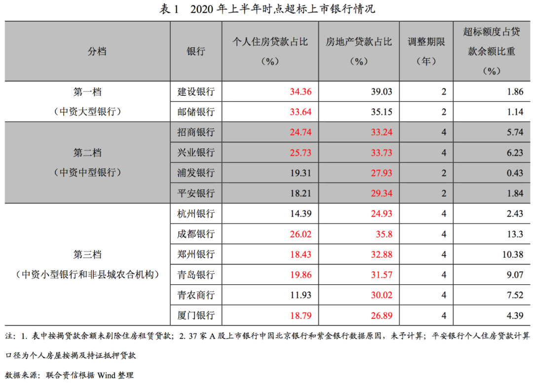根據35家國內上市銀行2020年半年報經營數據計算,有12家銀行超出監管上限(詳見表1),其中第一檔銀行中,建設銀行和郵儲銀行個人住房貸款占比超出監管上限均在2pct以內,有兩年調整過渡期;第二檔銀行中,招商銀行和興業銀行個人住房貸款占比及房地產貸款占比超出監管上限均在2pct以上,有四年調整過渡期,浦發銀行和平安銀行房地產貸款占比超出監管上限在2pct以內,有兩年過渡期;第三檔銀行中,杭州銀行、成都銀行、鄭州銀行、青島銀行、青農商行以及廈門銀行均不同程度超出監管上限,第四檔中無上市銀行超標。銀行在2020年下半年發放按揭貸款規模較大,以2020年末時點計算的超上限銀行個數可能會增加。