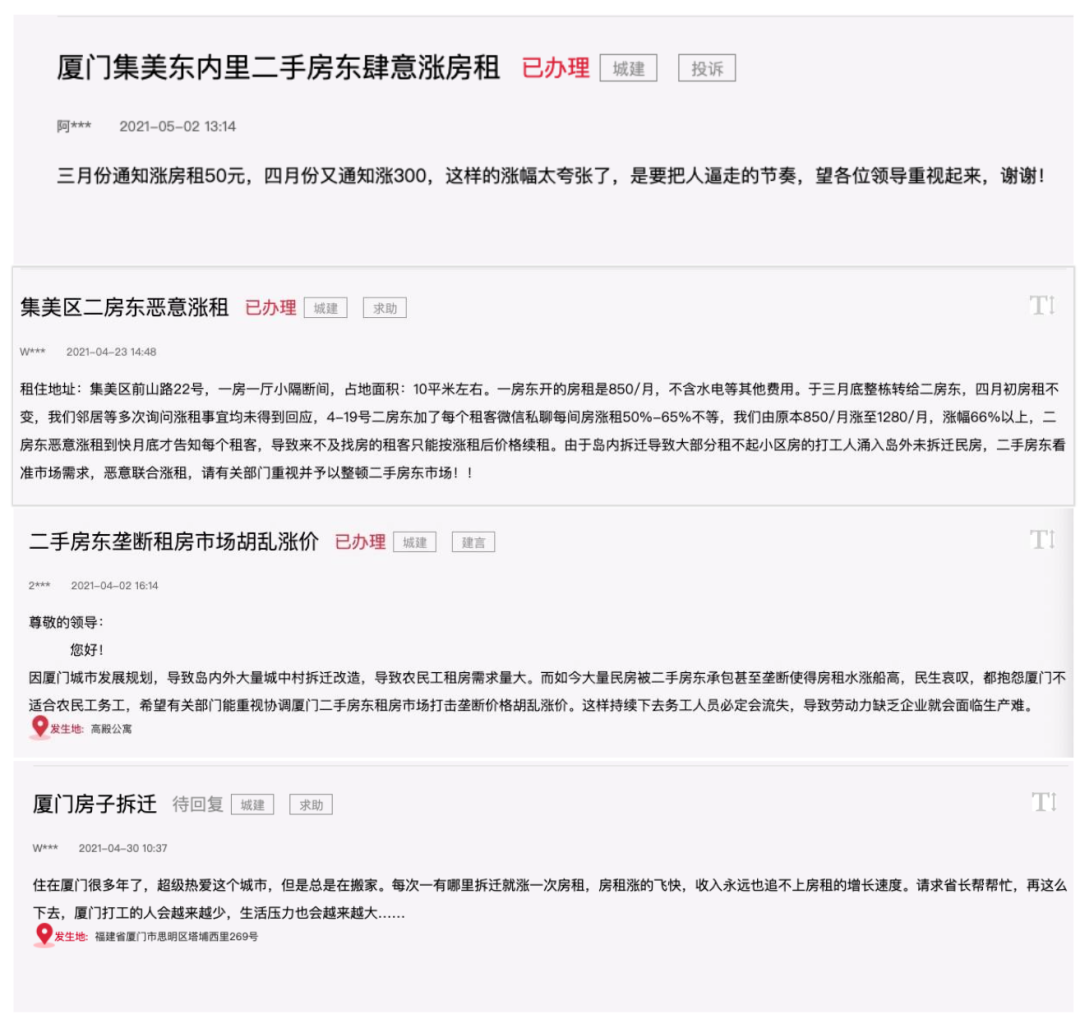 所以,沒(méi)有被拆遷波及的城中村以及小區(qū)的房源變得緊俏,租客們時(shí)不時(shí)就會(huì)收到房東發(fā)來(lái)的漲租問(wèn)候。在人民網(wǎng)的「領(lǐng)導(dǎo)留言板上」,有不少?gòu)B門(mén)租客反映被無(wú)序漲租。